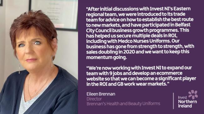 Brennan’s Health and Beauty Uniforms is also increasing its workforce to keep up with increased demand from the pandemic. Set up by experienced seamstress Eileen Brennan to provide a range of work wear for the healthcare sector, the company expanded into PPE and has achieved export market growth with our support.