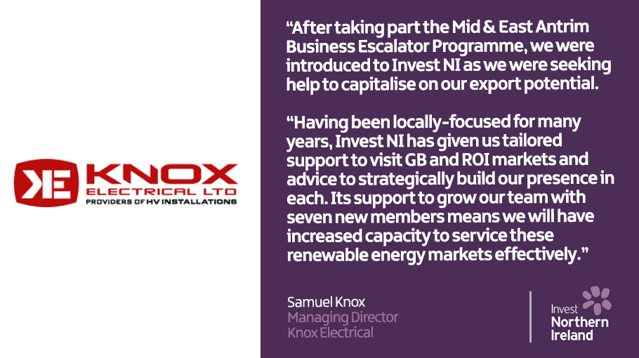 Following Fermanagh and Omagh District Council’s Advancing Business Growth Programme, we’ve given William and Henry Alexander Limited support for software and to create five jobs as work has increased in GB and ROI. Similarly, after Ballymena electrical contractor Knox Electrical took part in Mid & East Antrim Council’s Business Escalator Programme the council made introductions see how we could help further.