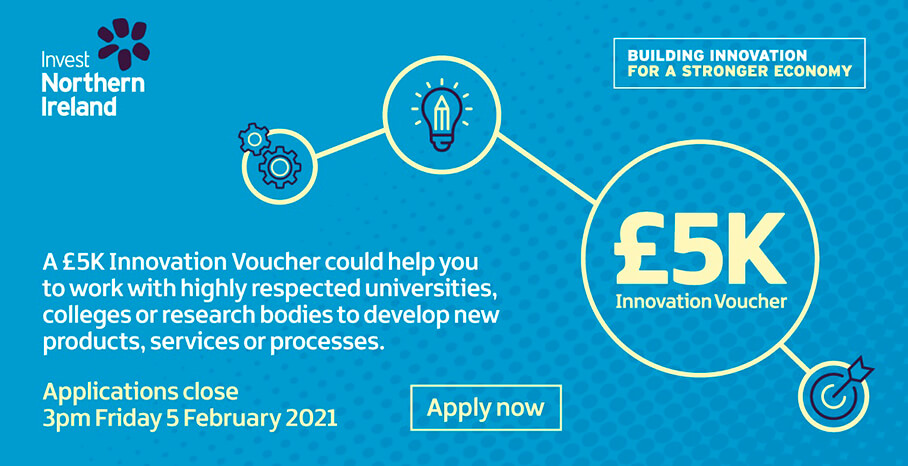 Invest NI’s Innovation Voucher call opened for applications on 18th January 2021 and will close on Friday 5th February 2021 at 3pm. To apply go to www.investni.com/innovation-vouchers